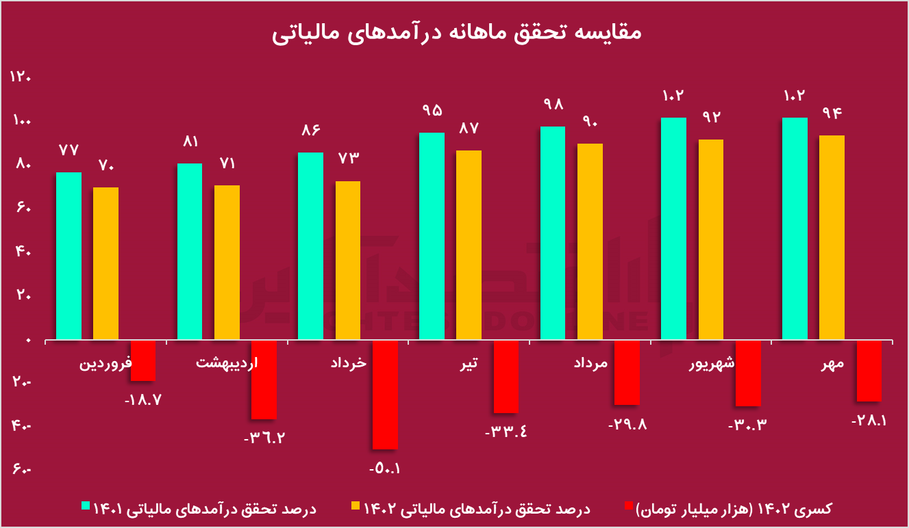 تاکید بر درآمدهای مالیاتی همواره یکی از رویکردهای اصلی دولت سیزدهم بوده است؛ به نحوی که بودجه نیز با تکیه بر درآمدهای مالیاتی نگاشته شده است؛ اما نمودار تحقق درآمدهای مالیاتی در طی سه سال اخیر حاکی از آن است که در سال ۱۴۰۲ شاهد کسری در تحقق درآمدهای مالیاتی بودهایم. به شکلی که این کسری در خرداد ماه ۱۴۰۲ به بالای ۵۰ هزار میلیارد تومان رسید.