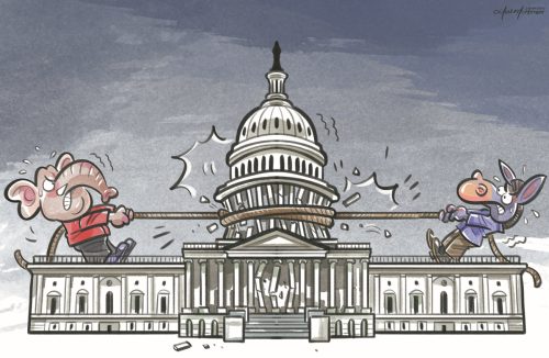 روزنامه چاینا دیلی با انتشار کاریکاتوری تحت عنوان «تعطیلی دولت آمریکا پایانی ندارد» به بحران تعطیلی دولت فدرال اشاره کرده است. این کاریکاتور که نمادی از کشمکشهای حزبی در واشنگتن است، فیل (نماد حزب جمهوریخواه) و الاغ (نماد حزب دموکرات) را در حال کشیدن طنابی نشان میدهد که دور ساختمان کنگره پیچیده و این عمارت در حال فروپاشی است، در حالی که نشانههای شکستگی و آشفتگی از آن به بیرون میزند.