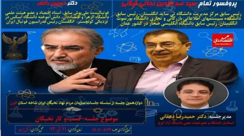 در راستای ارتقای جایگاه علمی و اقتصادی نخبگان کشور و توسعه تعاملات بین‌المللی در عرصه علم و نوآوری، سازمان مردم‌نهاد نخبگان ایران – شاخه استان البرز – دوازدهمین نشست از سلسله جلسات علمی خود را با حضور چهره‌های برجسته علم و اقتصاد جهان برگزار می‌کند.