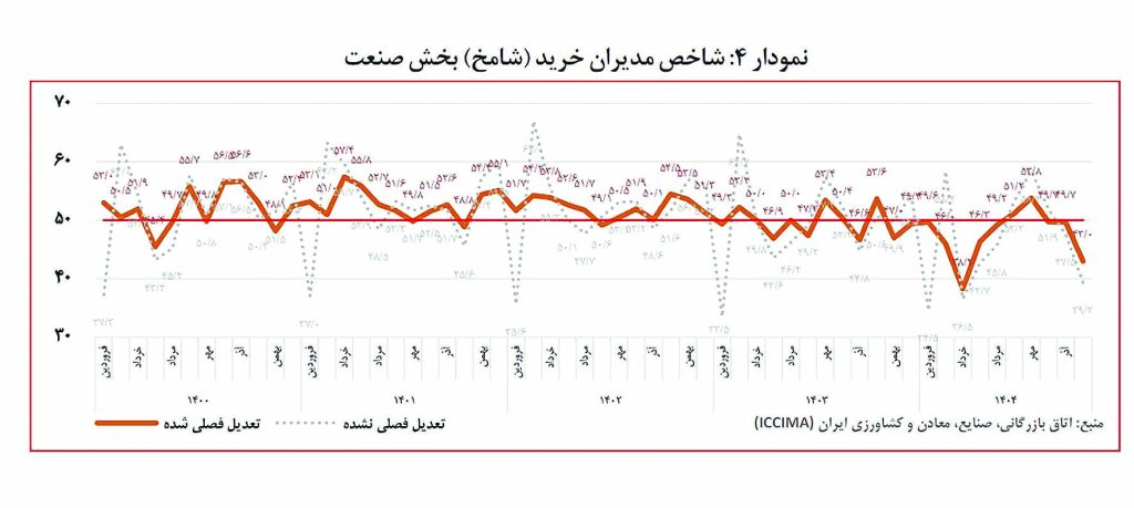 شاخص مدیران خرید بخش صنعت نیز در دیماه به عدد ۰/۴۳ کاهش یافته که کمترین مقدار هفتماهه محسوب میشود. افت این شاخص ناشی از کاهش در همه مولفههای اصلی از جمله تولید، سفارشات جدید، موجودی مواد اولیه و اشتغال است. تقریبا تمامی صنایع بهجز چند زیربخش محدود، کاهش فعالیت را تجربه کردهاند و این امر نگرانی از تعطیلی واحدهای تولیدی را افزایش داده است.