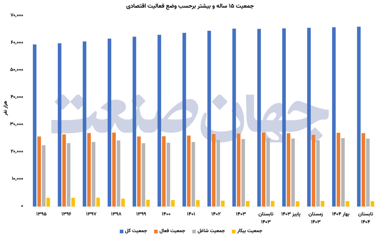 اگر نرخ بیکاری را «سطح آب» بازار کار بدانیم نرخ مشارکت اقتصادی «عمق» آن است. پاییز۱۴۰۴ نشان می‌دهد عمق بازار کار درحال کم‌شدن است. نرخ مشارکت اقتصادی جمعیت ۱۵ساله و بیشتر به‌۷/‏۴۰‌درصد رسیده؛ رقمی که نسبت‌به ‌پاییز۱۴۰۳ حدود ۵/‏۰واحد‌درصد کاهش یافته است. این‌افت شاید در ظاهر کوچک باشد اما درمقیاس جمعیتی ایران معنای بزرگی دارد. جمعیت فعال کشور در پاییز۱۴۰۳ معادل ۲۶‌میلیون‌و۹۳۵‌هزارنفر بود. این‌عدد در تابستان۱۴۰۴ به‌۲۶‌میلیون‌و۹۳۸‌هزارنفر رسید اما همزمان جمعیت کل ۱۵ساله و بیشتر افزایش یافته است. درمقابل جمعیت غیرفعال شامل دانش‌آموزان، دانشجویان، خانه‌داران، بازنشستگان و افرادی که از جست‌وجوی کار منصرف شدند به‌۳۹‌میلیون‌و‌۳۰۰‌هزارنفر رسیده یعنی افزایشی حدود ۸۰۰‌هزارنفر نسبت‌به ‌پاییز سال قبل. این‌روند زمانی معنادارتر می‌شود که به‌عقب برگردیم. نرخ مشارکت اقتصادی از ۵/‏۴۴‌درصد در سال۱۳۹۷ به‌۳/‏۴۱‌درصد در۱۳۹۹ سقوط کرد یعنی افتی سه‌واحدی که عمدتا تحت تاثیر رکود کرونایی رخ داد. پس از آن این‌نرخ در محدوده ۴۰تا۴۱‌درصد تثبیت شد: ۹/‏۴۰‌درصد در۱۴۰۰، ۹/‏۴۰‌درصد در۱۴۰۱، ۳/‏۴۱‌درصد در۱۴۰۲ و ۴۱‌درصد در۱۴۰۳. اکنون با ثبت ۷/‏۴۰‌درصد در پاییز۱۴۰۴ بازار کار باردیگر به‌مرزهای پایین مشارکت نزدیک شده است. کاهش مشارکت زمانی نگران‌کننده‌تر می‌شود که بدانیم نرخ بیکاری همزمان درحال افزایش است. در بسیاری از سال‌های گذشته کاهش بیکاری با افت مشارکت همراه بوده یعنی بخشی از بهبود ظاهری بازار کار ناشی از خروج افراد از جمعیت فعال بود اما اکنون ترکیب تازه‌ای شکل گرفته: هم بیکاری بالا رفته و هم مشارکت پایین آمده است. این‌وضعیت می‌تواند نشانه‌ای از