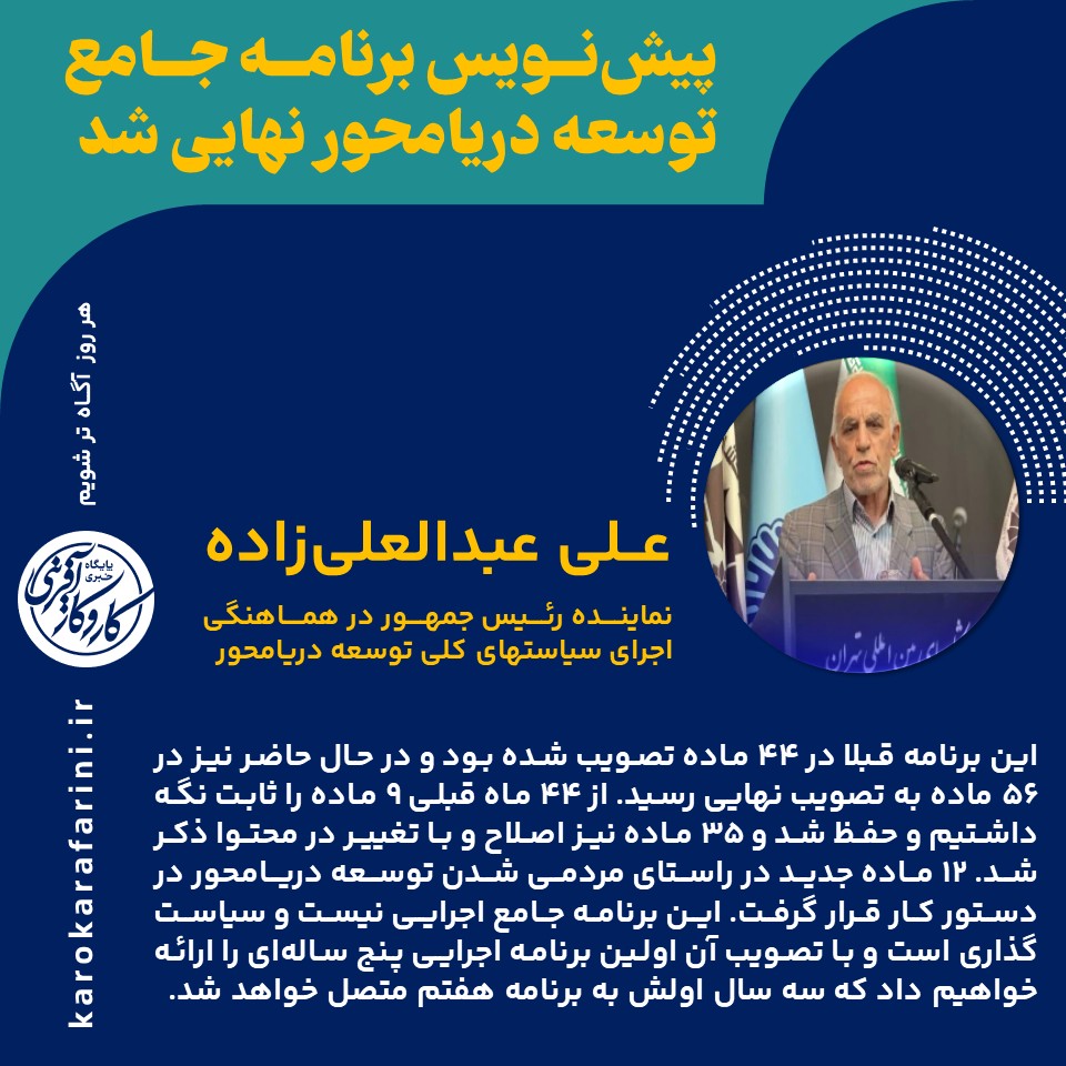 وی افزود: این برنامه جامع در دولت چهاردهم بازنگری مجدد شد و اعلام شد که مواردی در آن دیده نشده که باید در برنامه قرار گیرد و امروز بعد از شش ماه کار مدون، نتیجه نهایی به تصویب کارگروه هماهنگی توسعه دریا محور رسید که قرار است تقدیم شورای هماهنگی توسعه دریامحور شود و بعد از تصویب آنها و تصویب در دولت به دستگاه ها ابلاغ خواهد شد.